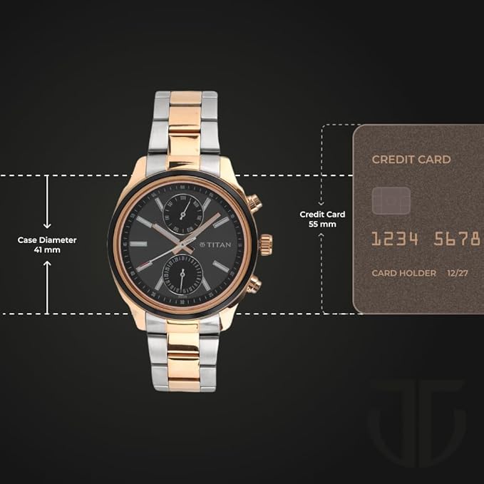 Elevate your style with this sophisticated multifunction watch from Titan’s Metropolitan Luxe collection. Featuring a sleek black dial accented with dual sub-dials and a date function, this timepiece balances bold design with everyday functionality. The two-tone stainless steel bracelet, blending silver and rose gold, adds a touch of refined luxury that complements both formal and smart casual attire. Perfect for the modern man who appreciates elegance with an edge.